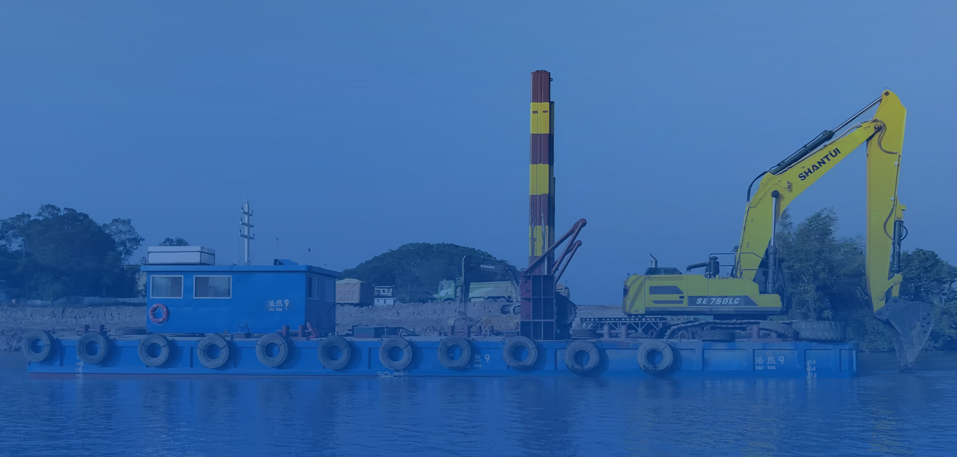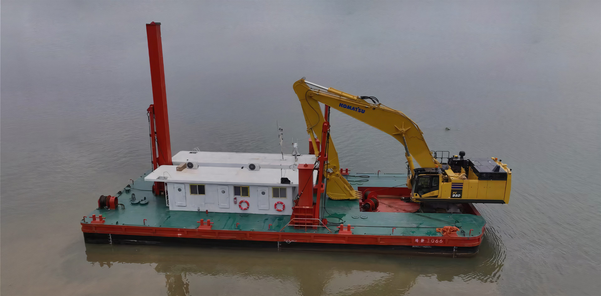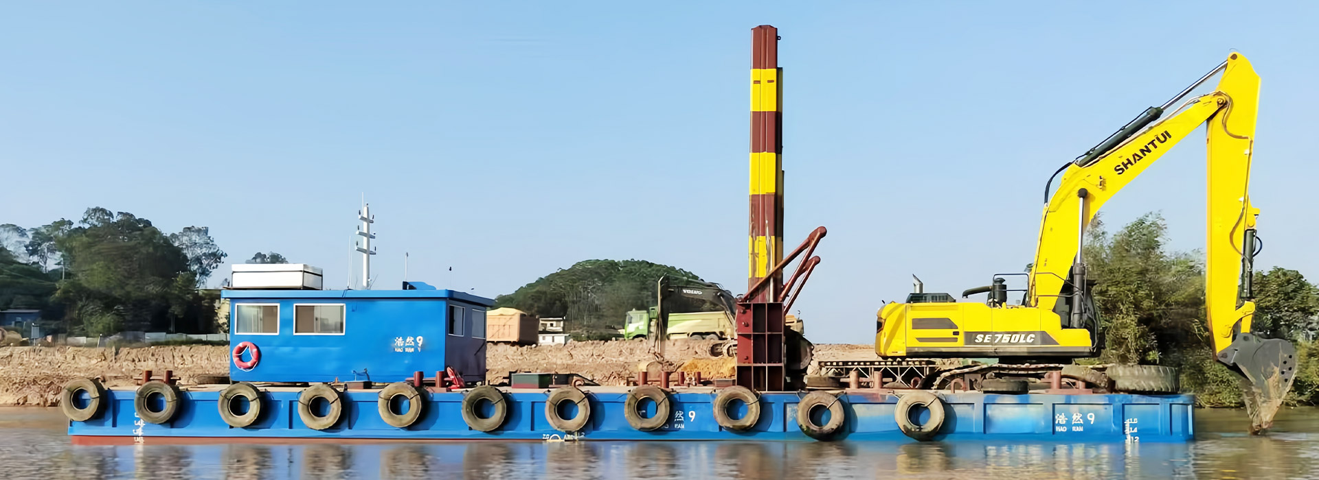 2、施工平臺穩(wěn)性強,方便挖掘機在深水區施工作業。并且,平臺自帶航行動力,便于水上調遣。